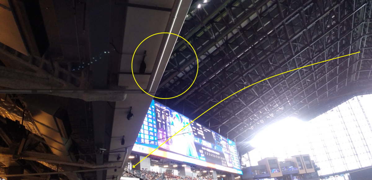 最近たまに「ファウルボールが当たって怪我」というニュースを聞く。球場によってファウルネットの張り方に差があるが、エスコンフィールドは全体的にネットが高い部類だと思う。なのでライナー性のファウルボールはほとんど飛んでこないのかも知れないが、フライ性のファウルボールは普通に飛んでくる。この日もプレイボール直後に○のあたり(3階席のテラス)にファウルボールがヒット、7回くらいに矢印のライン(打球の方向はほとんど一緒)でファウルボールが飛んできた。着弾地点は自分の席から10メートルも離れていなかった=「自分の所に飛んでくる可能性も十分ある」わけで、「のんびり撮影していてファウルボールが直撃したら笑えないよなぁ」と思った。